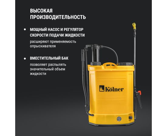 ВЫСОКАЯ ПРОИЗВОДИТЕЛЬНОСТЬ: мощный насос и регулятор скорости подачи жидкости расширяют применяемость опрыскивателя, а вместительный бак позволяет распылять значительный объем жидкости.