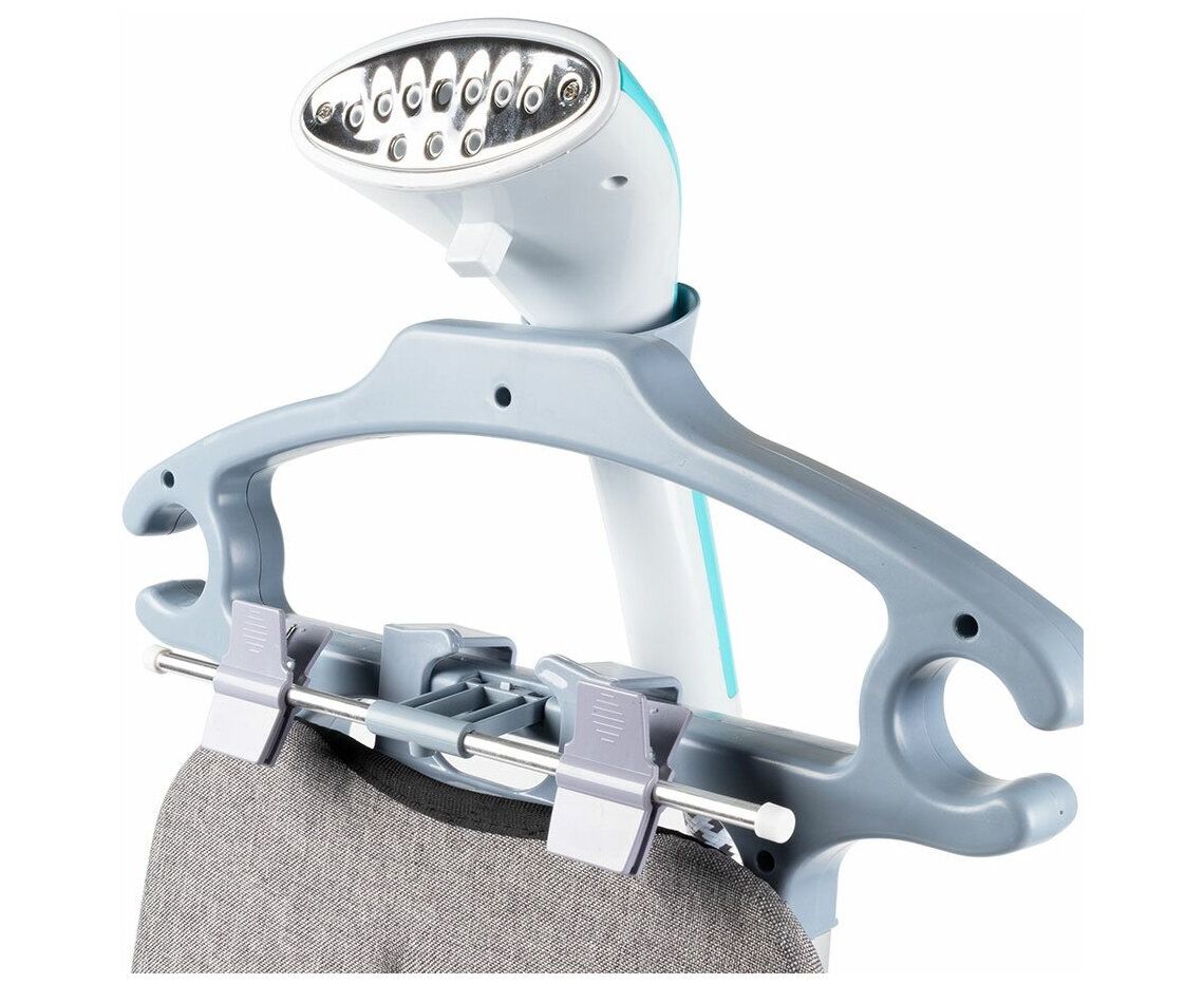складные плечики с зажимами для фиксации брюк и юбок, тефлоновая термостойкая защитная рукавица, съемный гладильный столик, долив воды во время работы