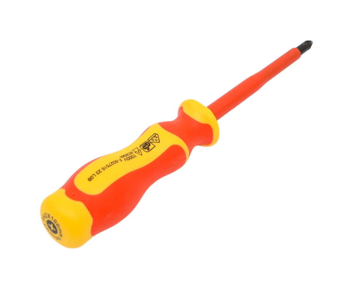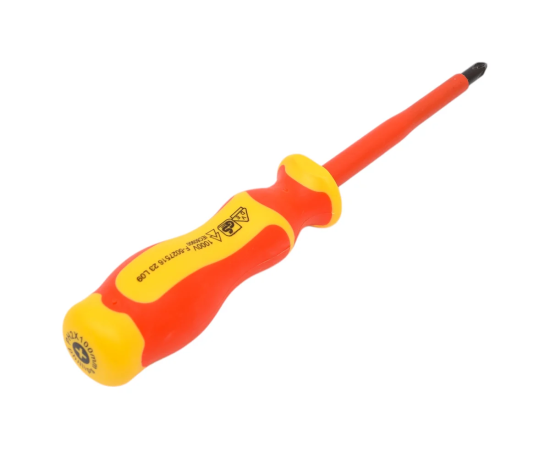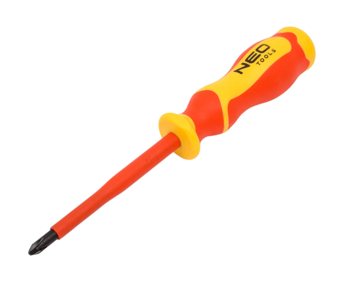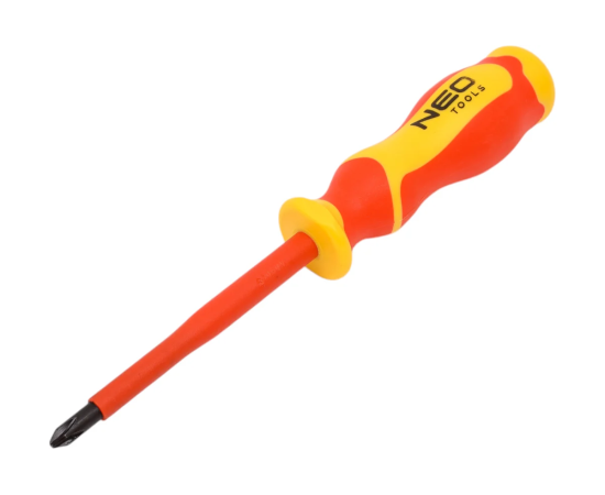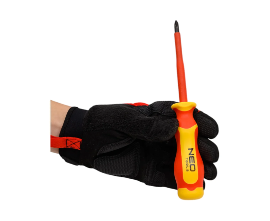 NEO Tools Отвертка PH2 x 6 x 100 mm 1000 В 04-139 сертифицирована для работы под напряжением до 1000 В. Стержень отвертки изготовлен из прочной S2 стали. Отвертка с намагниченным жалом. Специальная эргономичная форма рукоятки уменьшает нагрузку на ладонь во время работы. Двухкомпонентная рукоятка предотвращает скольжение в ладони, стойкая к воздействию химических веществ, масел и смазок. Надежность продукта подтверждает 25-летняя гарантия.