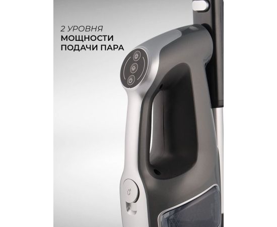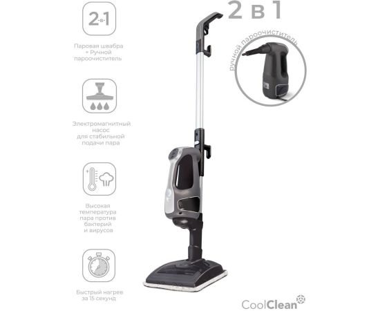 Конструкция 2-в-1 (паровая швабра плюс ручной пароочиститель). Второй режим предназначен для очищения зеркальных поверхностей, керамической плитки, а также отпаривания одежды.