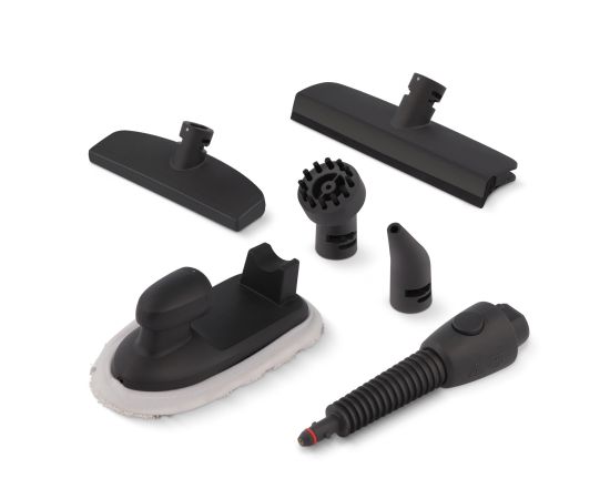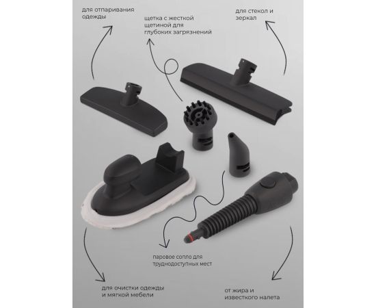 В комплект с прибором входят 6 насадок для очищения различных поверхностей, специальная тряпочка и шланг для пароочистителя.