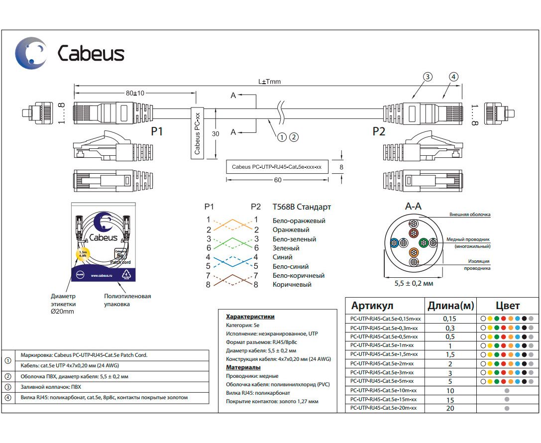 Диаметр кабеля: 5,5 мм ±0,2 мм
