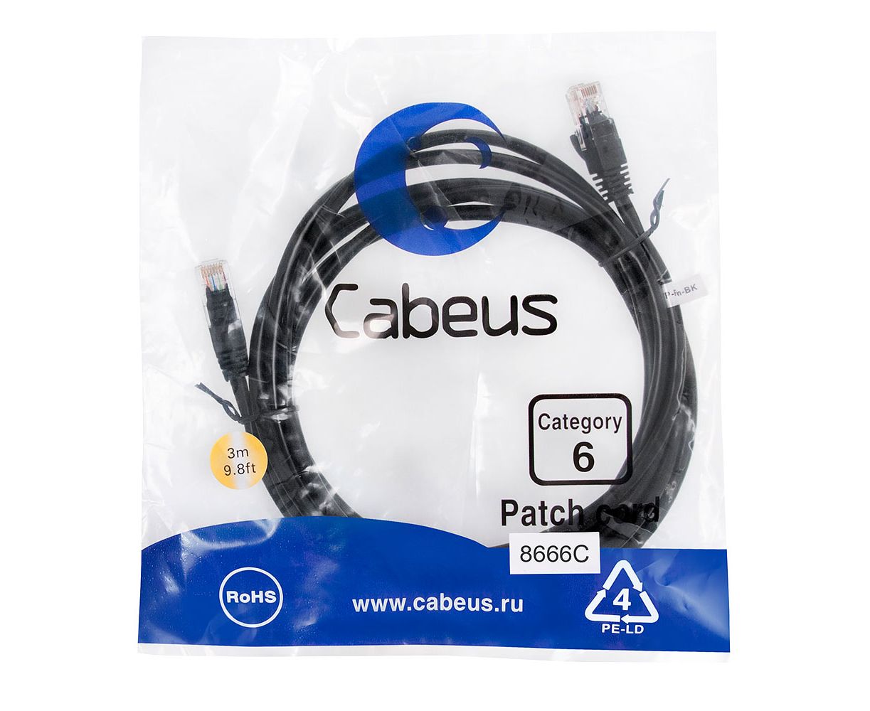 Патч-корд Cabeus PC-UTP-RJ45-Cat.6-3m-BK неэкранированный, черный