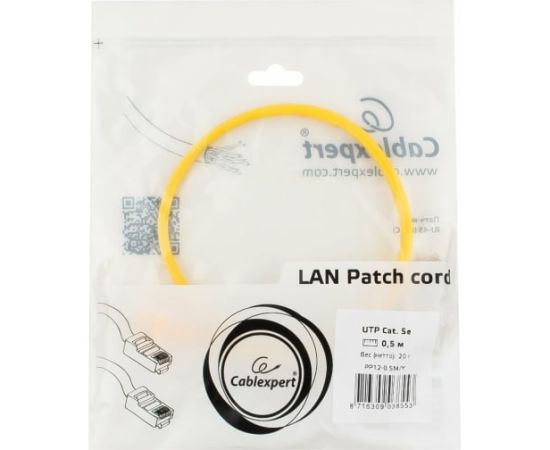Патч-корд Cablexpert PP12-0.5M/Y UTP кат.5e, 0.5м, литой, многожильный (жёлтый)