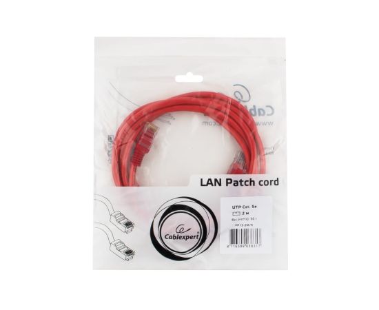 Патч-корд UTP5e, 2 м, литой, многожильный, биметалл CCA, 26AWG, PVC, красный CABLEXPERT PP12-2M/R