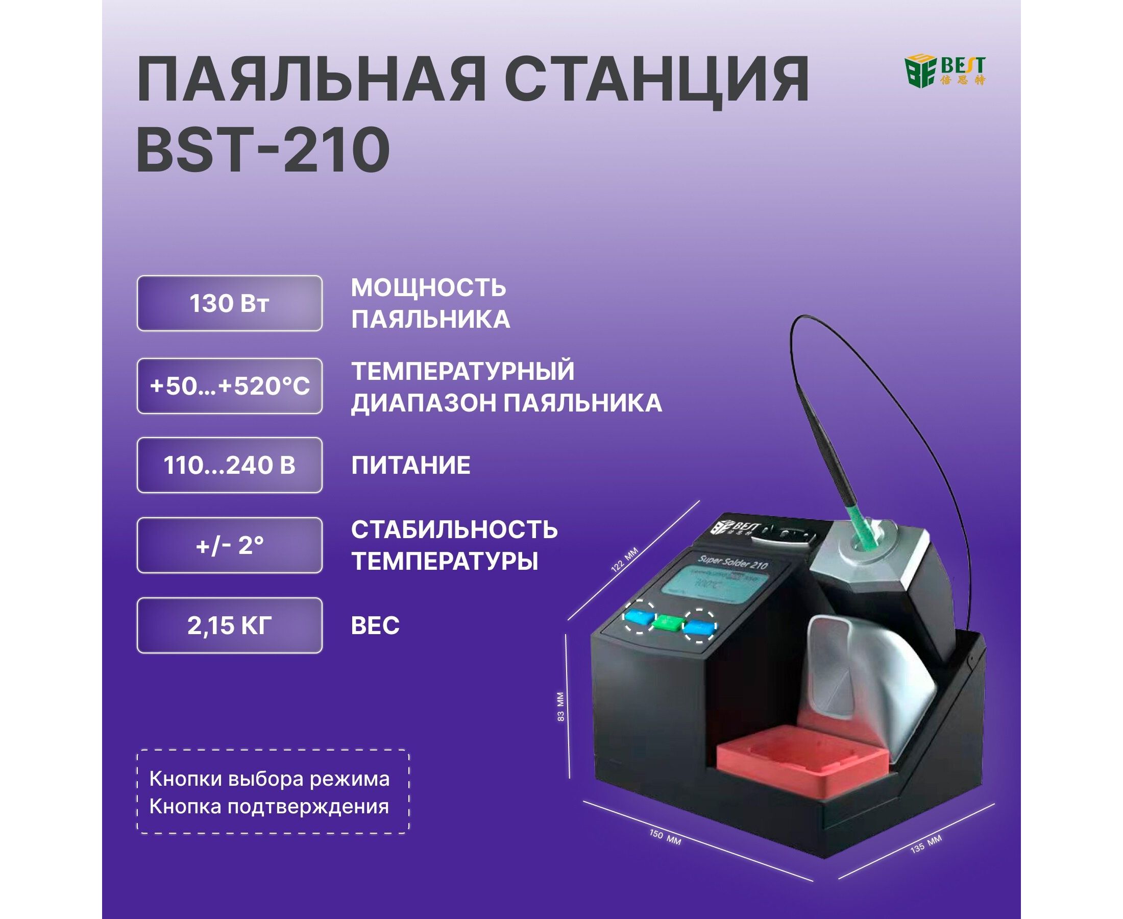 Контроль мощности и температуры: BST-210 обеспечивает высокую выходную мощность до 130 Вт, что позволяет эффективно выполнять пайку и распайку. Диапазон температур регулируется от 50°C до 520°C, обеспечивая точный контроль над процессом пайки.