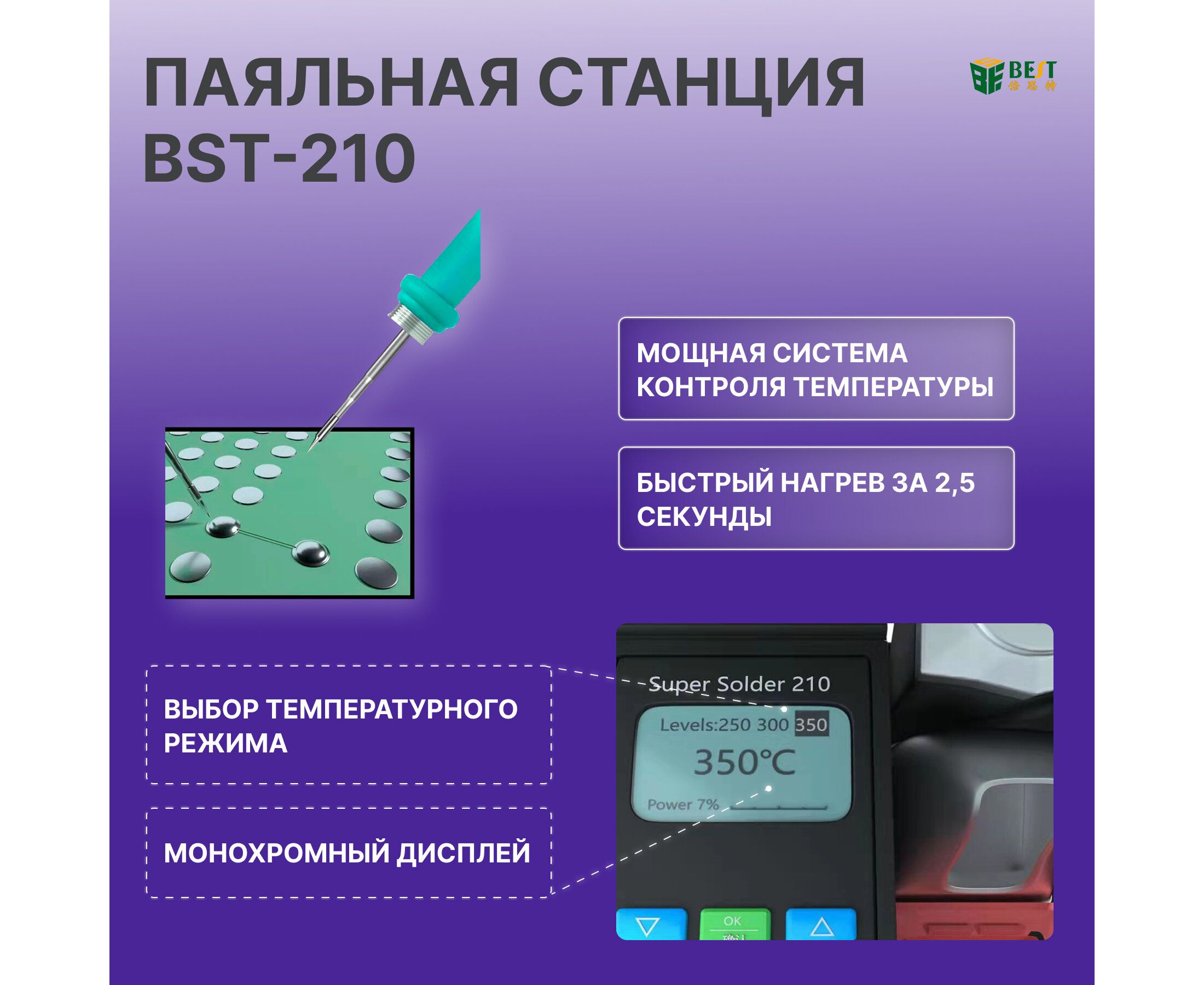 BST-210 — это высокопроизводительная интеллектуальная паяльная станция, предназначенная для различных применений, включая сварку и ремонт печатных плат BGA (с шариковой решеткой). Это универсальный инструмент, подходящий как для профессиональных, так и для любительских целей. Ключевые особенности: