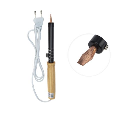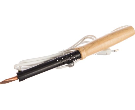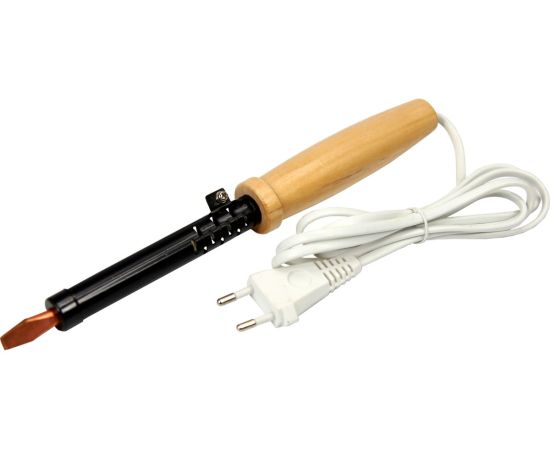Паяльник ПД 220В 100Вт деревянная ручка ЭПСН Россия REXANT 12-0291 служит для пайки и лужения деталей и заготовок из стали и меди. Подходит для работы с оловянно-свинцовыми припоями. Нагревательный элемент представляет собой нихромовую спираль. Рабочая часть устройства выполнена из меди высокого качества. Рукоятка изготовлена из древесины, имеет удобную форму. Сетевой шнур имеет надежную двойную ПВХ изоляцию. Провод с прочной вилкой, совместимой с отечественными розетками. Паяльник соответствует II классу электрозащиты, может использоваться как в домашних условиях, так и на производственных участках.