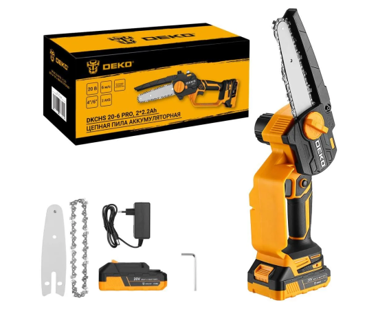 Пила цепная DEKO DKCHS 20-6 Pro (083-2011), 4" и 6", 20В, 2x2.2Ач, 2 шины и 2 цепи