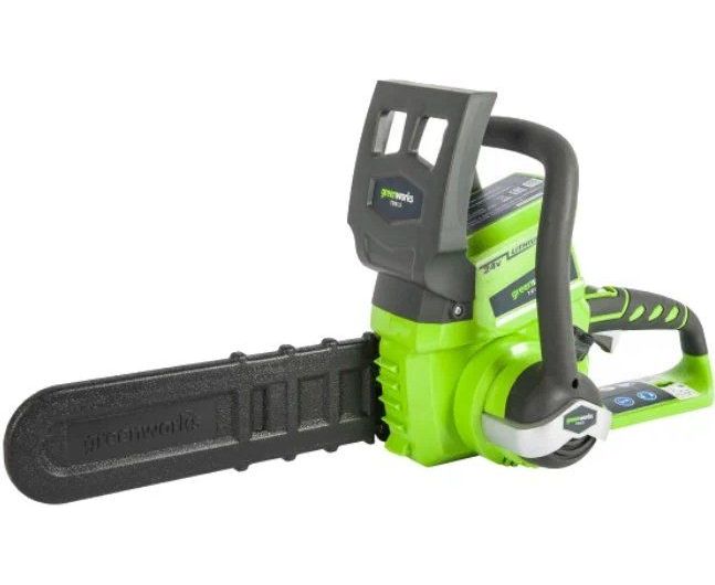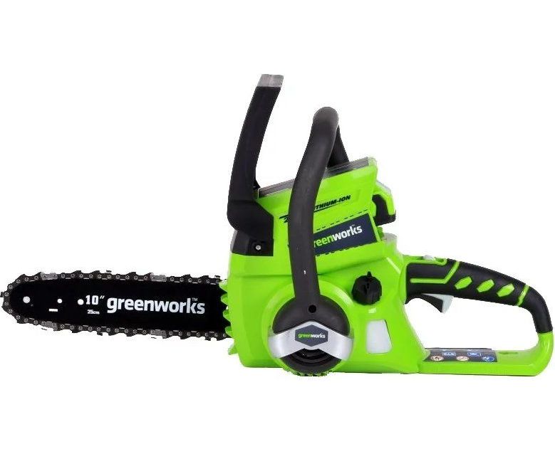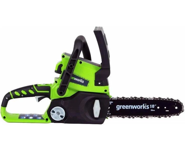 Цепная аккумуляторная пила Greenworks G24CS25, 24V (артикул 2007707) - небольшая, легкая (всего 2,6 кг.) садовая пила. Благодаря ее компактным размерам она легко помещается в багажнике автомобиля или даже в рюкзаке. Это отличный выбор для подрезки толстого кустарника или сучков, пиления бревен.