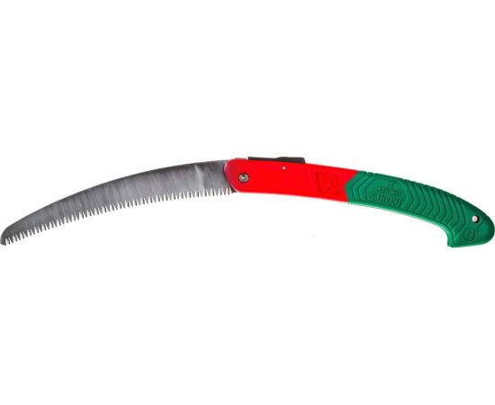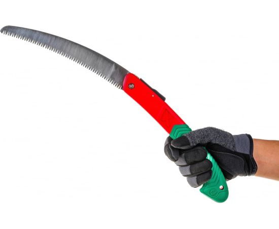 Пила складная с фиксатором изогнутое полотно — надежный помощник по уходу за кустарниками и небольшими деревьями в саду. Она также пригодится на рыбалке и в турпоходе. Инструмент предназначен для распила сухой древесины и небольших деревьев, обрезки ветвей. Зубья закалены индукционными токами и имеют трехгранную заточку, что в сочетании с зауженным утонченным полотном обеспечивает легкий и ровный рез, в том числе обратный. Особенно пила эффективна при работе выше уровня плеча. Изделие обладает износоустойчивостью и способно выдерживать интенсивные нагрузки.
