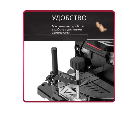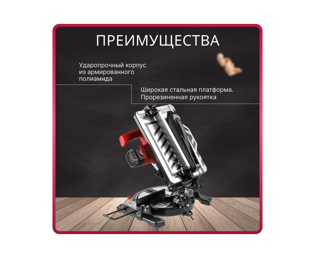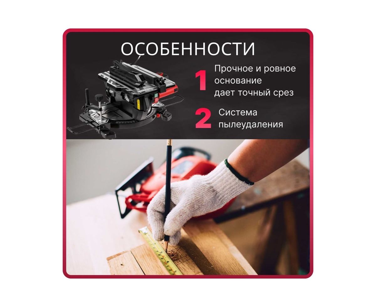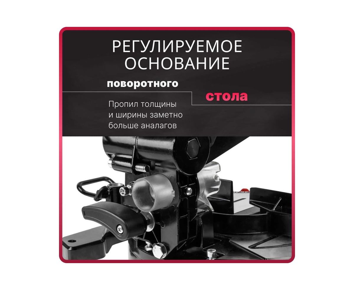 Надежное и прочное основание, ровный верхний стол 340х220 мм, яркий лазерный указатель и заводская юстировка позволяют добиться высокой точности реза.
