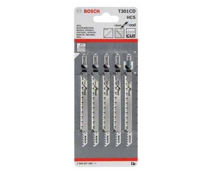 Пилки для лобзика BOSCH 2608637590 T301СD по дереву, ДСП 91мм, чистый рез, HCS, 5шт блистер, Упаковка
