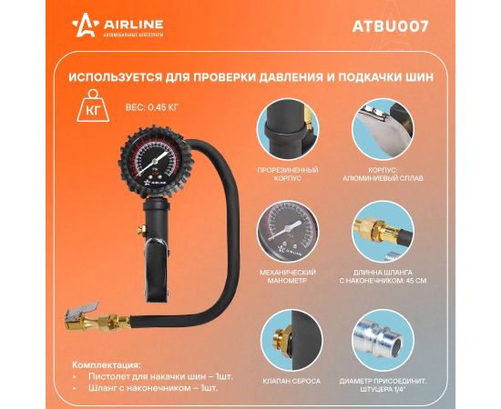 Пистолет для накачки шин с манометром Airline PRO 16АТМ, с клапаном сброса ATBU007 изготовлен из алюминиевого сплава. Манометр защищён резиновым чехлом.