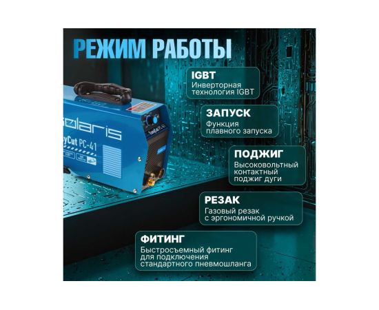 Плазморез SOLARIS EasyCut PC-41 используется для работы с различными токопроводящими материалами: углеродистая сталь, нержавеющая и оцинкованная сталь, алюминий, медь и пр. Устройство поможет выполнить резку металла с большой скоростью и высоким качеством среза. Высокочастотный поджиг дуги обеспечивает плавный и качественный старт. Одной из главных особенностей аппарата является регулировка продувки после резки до 20 секунд.