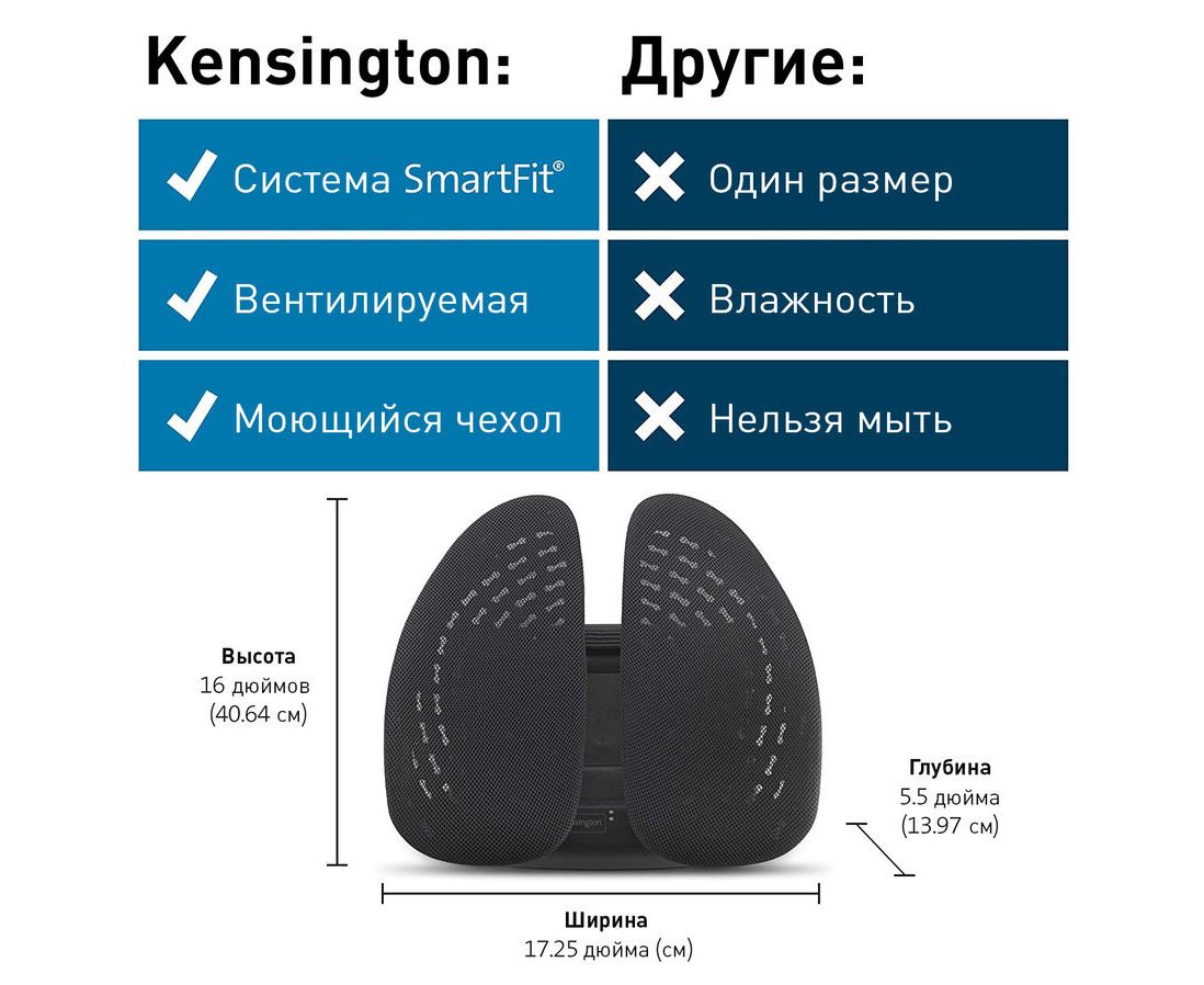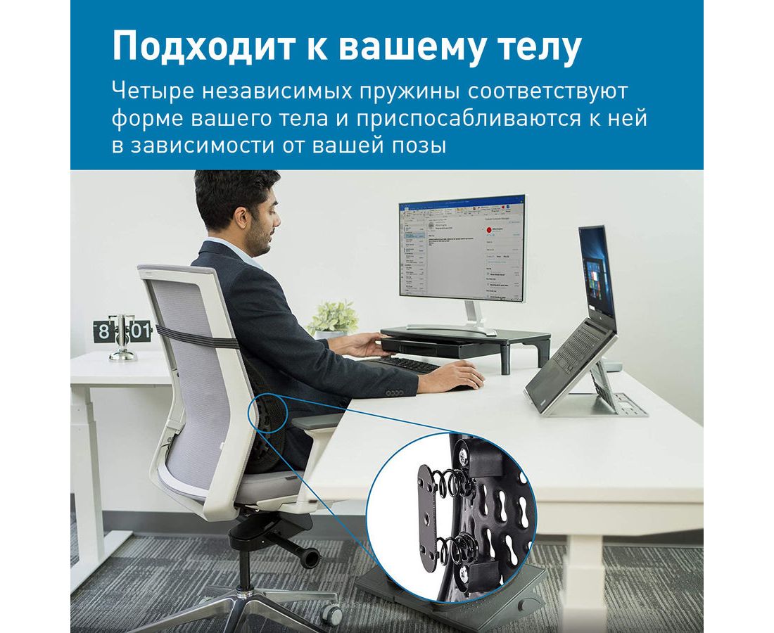 Эргономичная поддержка для спины. Система SmartFit обеспечивает индивидуальную регулировку высоты за 2 простых шага. 4 уровня высоты спинки. 2 независимые детали поддержки спины. Съемные тканевые чехлы; допустима машинная стирка. Прикрепляется к любому офисному креслу.