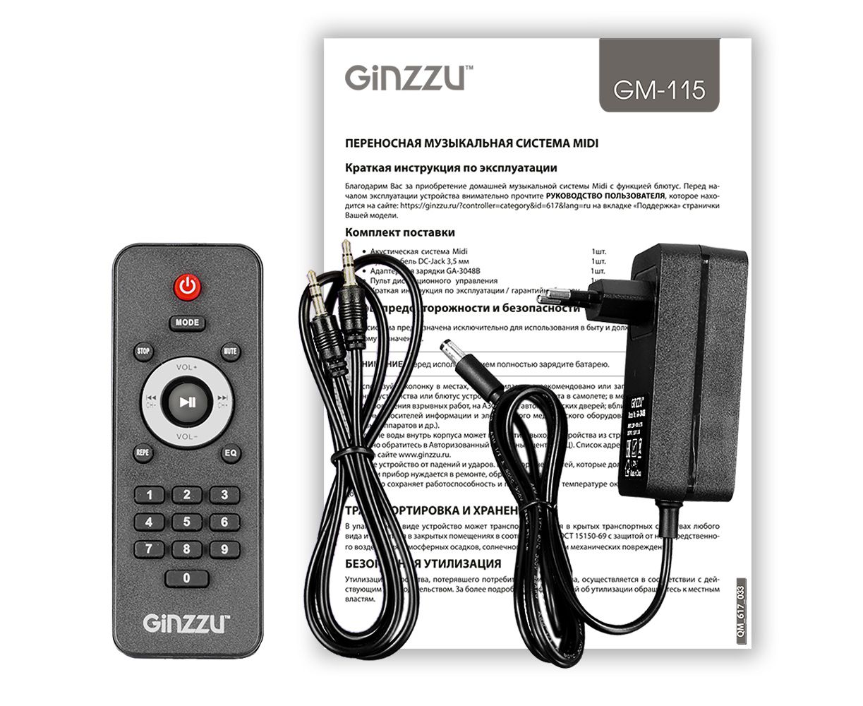 мидисистема, кабель аудио, адаптер GA-3048B для зарядки, пульт ДУ, краткая инструкция по эксплуатации и гарантийный талон