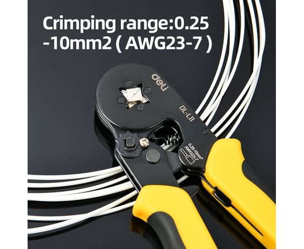 Пресс-клещи Deli DL-L11 предназначены для обжима наконечников НШВИ сечением от 0,25 до 10 кв.мм, что делает их универсальным решением для электромонтажных работ.