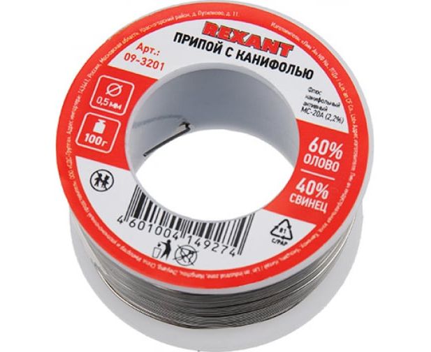 Припой с канифолью REXANT 09-3201 100г, 0.5мм, (олово 60проц., свинец 40проц.), катушка, блистер