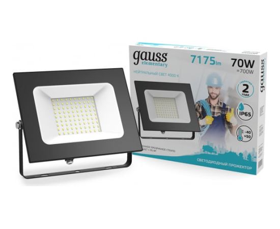 Светодиодный светильник Gauss Elementary, 70W, 7175lm, IP65, 4000К, черный, 1/10 613100270 прожектор Gauss Elementary созданный для экстерьерной общей подсветки зданий и сооружений, освещения складов, промышленных и торговых объектов, а также ландшафтных объектов, теперь имеет улучшенную модификацию корпуса.