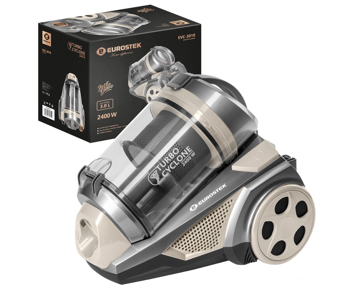 Пылесос без мешка Eurostek EVC-3010 технология МУЛЬТИ-Циклон, Многоуровневая система фильтрации: HEPA-фильтр+ микрофильтр, Максимальная мощность 2400 Вт., мощность всасывания 420 Вт., телескопическая металлическая трубка и щетка для пола, объем пылесборника 3 литра, длина шнура 5 метров, защита от перегрева, автоматическая смотка шнура, мотор с термостатом