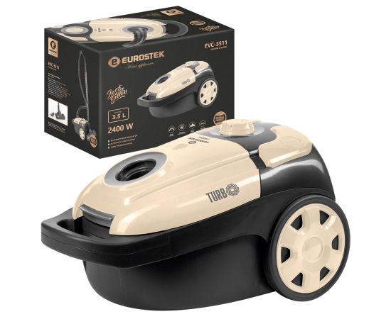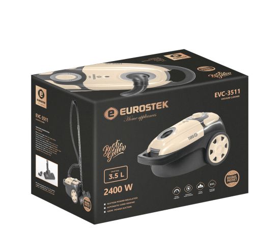 Пылесос с тканевым пылесборником Eurostek EVC-3511, Максимальная мощность 2400 Вт., мощность всасывания 420 Вт., многоступенчатая система фильтрации, телескопическая металлическая трубка и щетка для пола, объем пылесборника 3,5 литра, защита от перегрева, автоматическая смотка шнура, регулировка мощности, насадки в комплекте (щелевая, насадка-щетка)