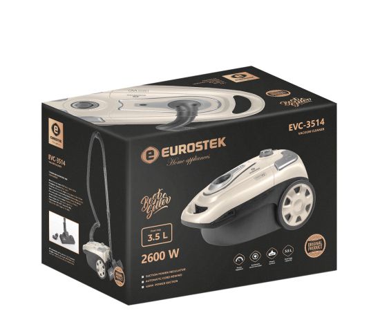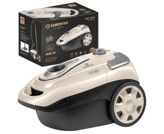 Пылесос электрический Eurostek EVC-3514 имеет мощность 2600 Вт, а мощность всасывания - 450 Вт. Тканевый пылесборник, объемом 3,5 л, индикатор заполнения пылесборника и функцию автоматической смотки шнура.