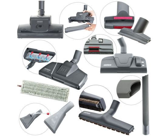 Насадки в комплекте насадка пол/ковер, насадка для мягкой мебели, насадка для сухой уборки паркета, турбощетка, щелевая насадка, насадка для влажной уборки паркета и ламината, распылительная насадка для мягкой мебели