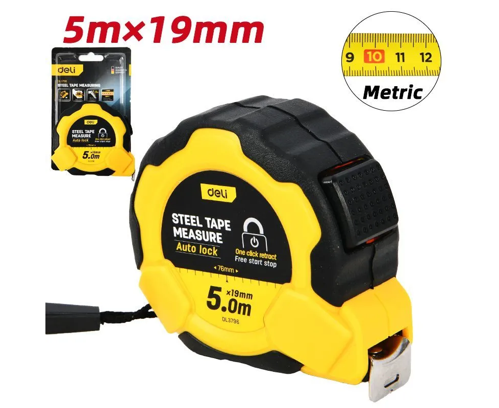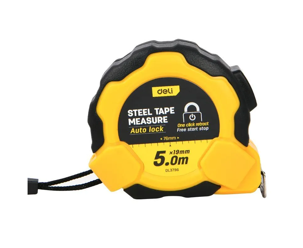 Рулетка Deli DL3796 5м*19мм, Автостоп, ударопрочный корпус, метрическая