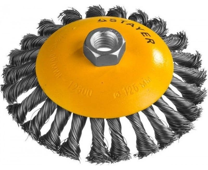 Описание Щетка STAYER 35135-125 "PROFESSIONAL" коническая с посадочным М14, плетёные пучки проволоки 0.5мм