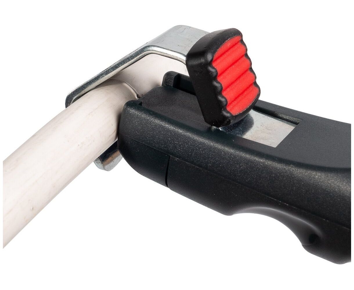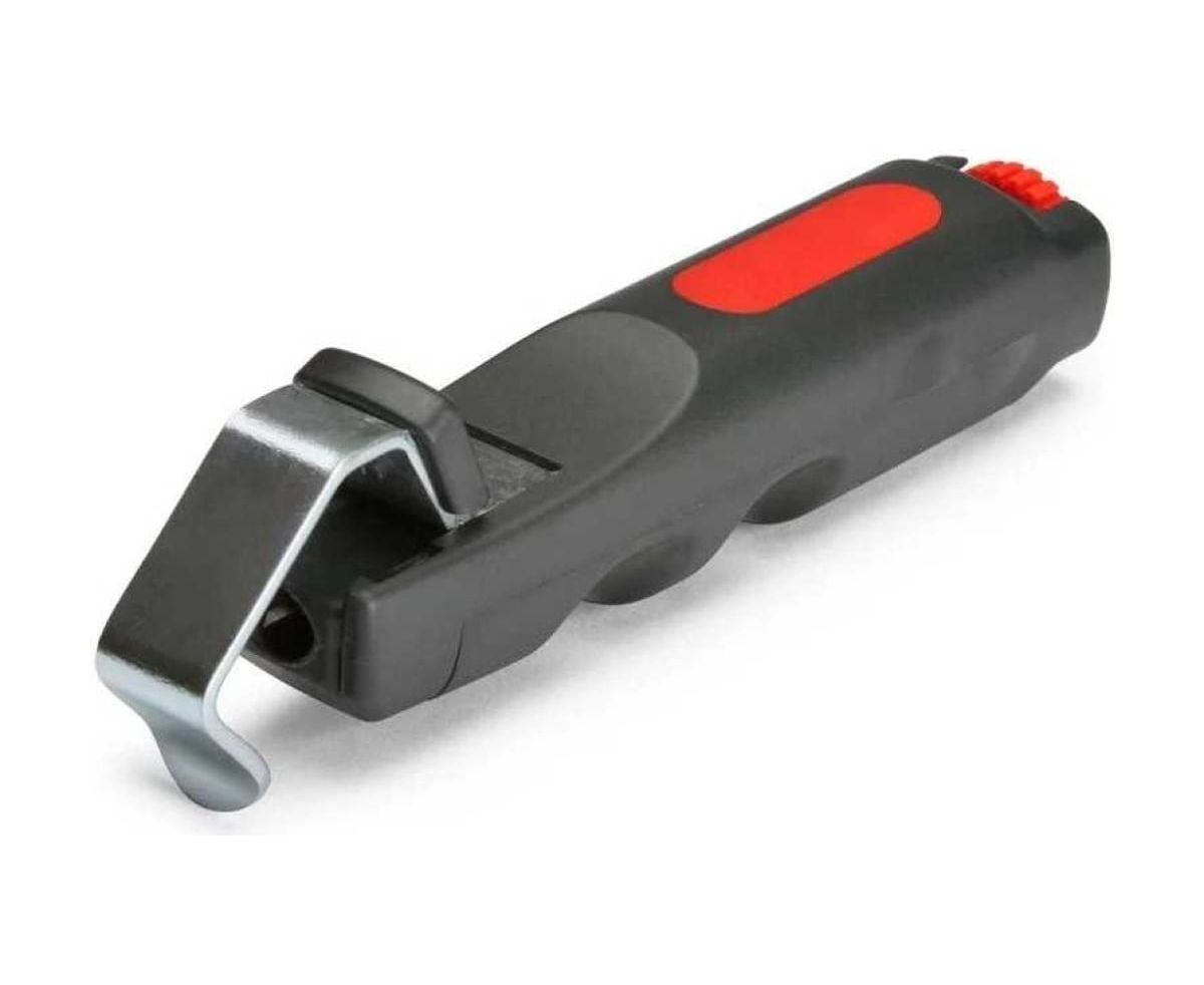 Инструмент для снятия изоляции КВТ КС-28у 70438 аккуратно делает надрезы на кабеле и снимает слой оболочки без повреждения металлических жил. Представляет собой компактное устройство в виде эргономичной рукоятки с прижимной скобой, которая фиксирует провод в рабочей зоне. С помощью автоматически поворачивающегося ножа и регулировки глубины реза можно осуществлять как продольные, так и поперечные разрезы защитных оболочек кабеля.