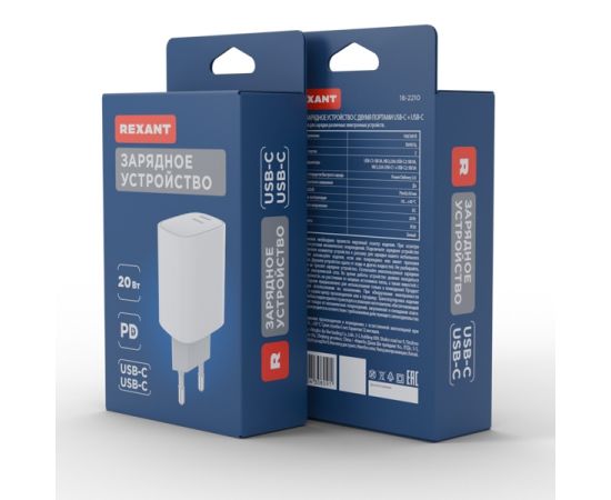 Сетевое зарядное устройство Rexant 18-2210 с двумя портами USB-C + USB-C, 20Вт