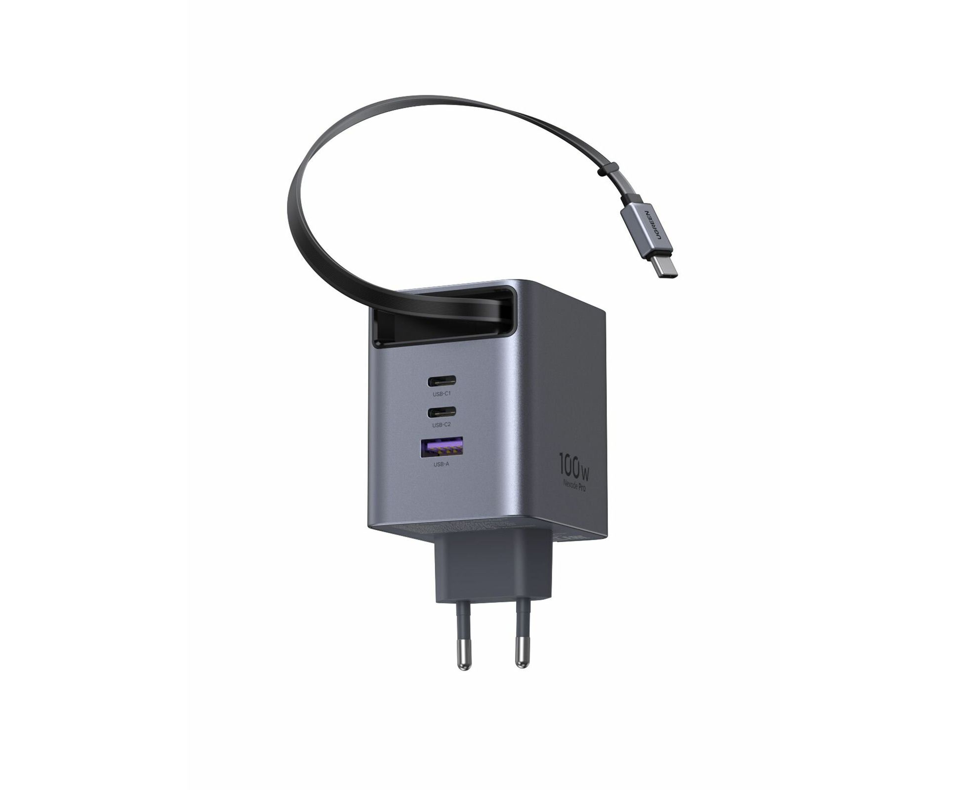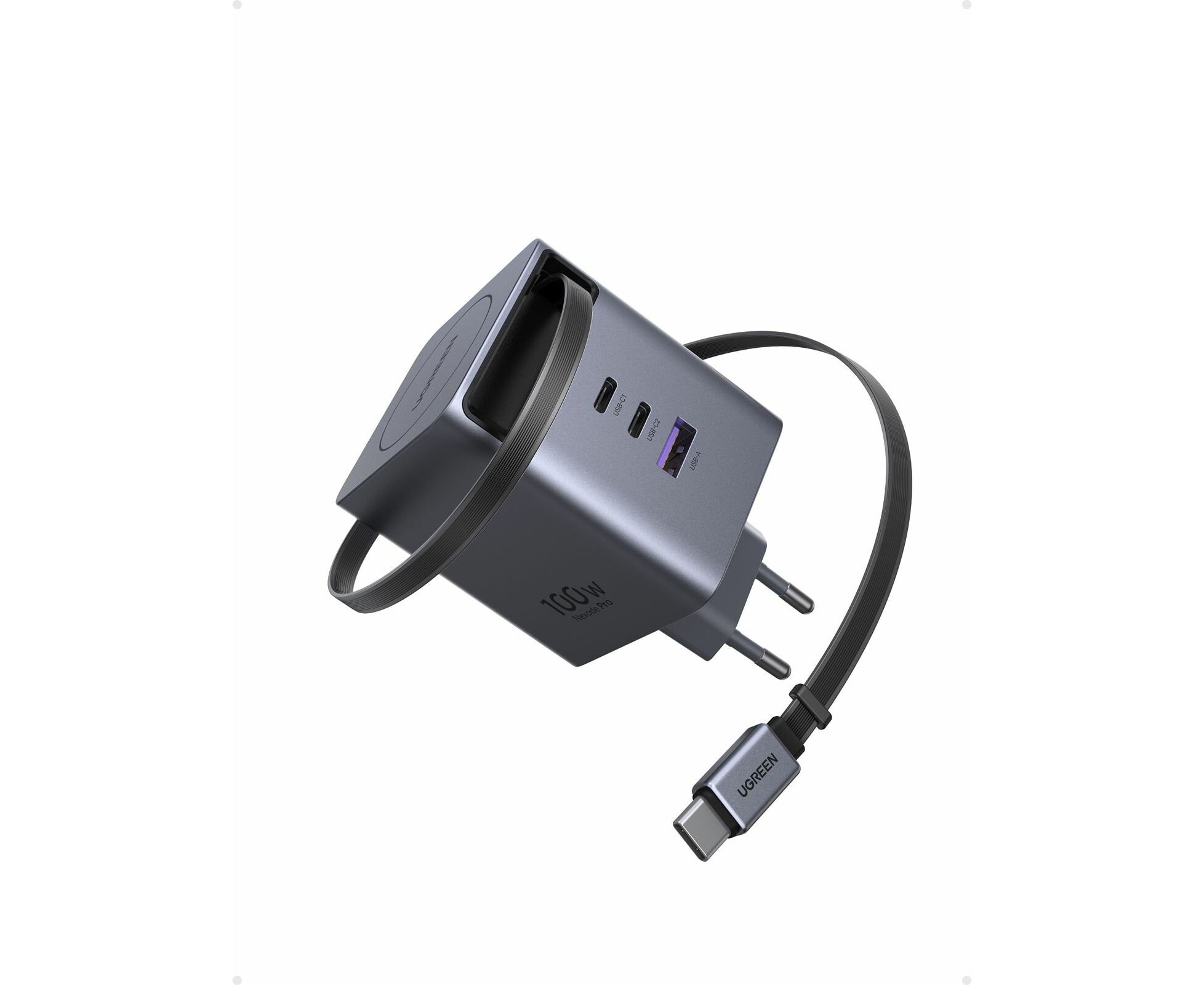 Сетевое зарядное устройство UGREEN X616 (65828) 100W GaN Fast Charger 2*USB-C USB-A with Retractable Cable USB-C серый космос