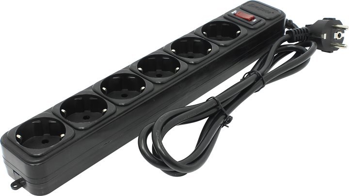 сетевой фильтр на 6 евророзеток, суммарная мощность нагрузки: 2.2 кВт, максимальный ток нагрузки: 10A, кабель 1.8м, чёрный