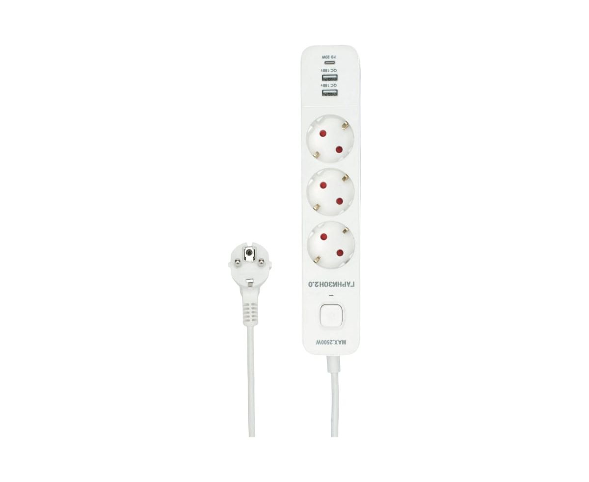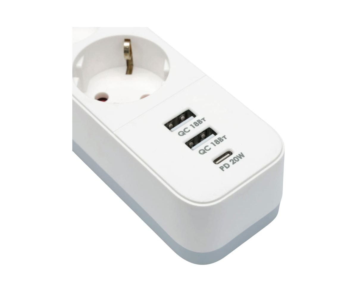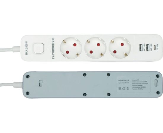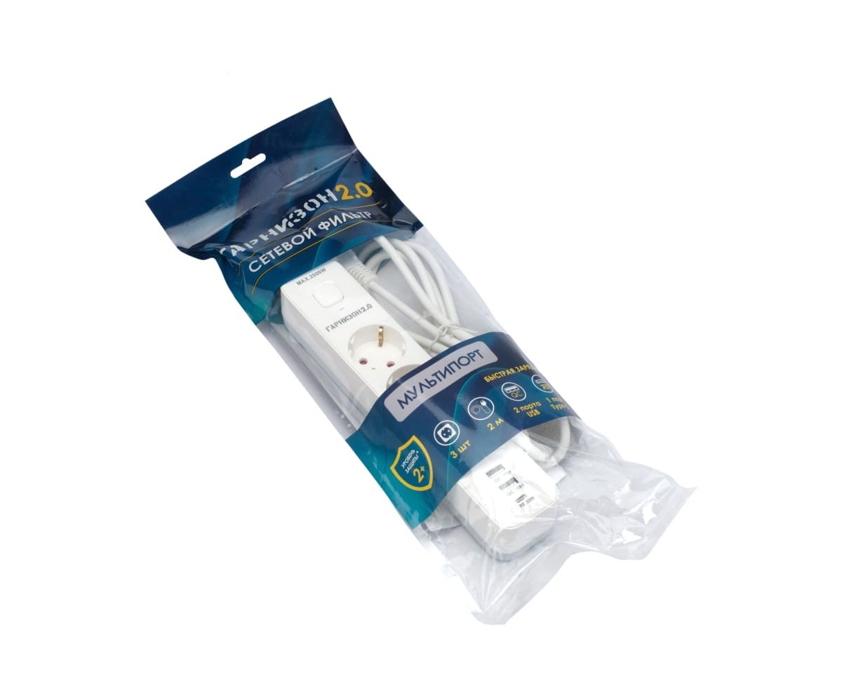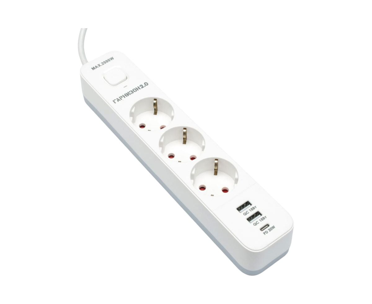 Сетевой фильтр Гарнизон EPS-3-CU2-W-2 2.0 Мультипорт 3р, 10А, 1xType-C PD, 2 х USB QC, 2м, ур.защиты 2+, белый, пакет (21448)