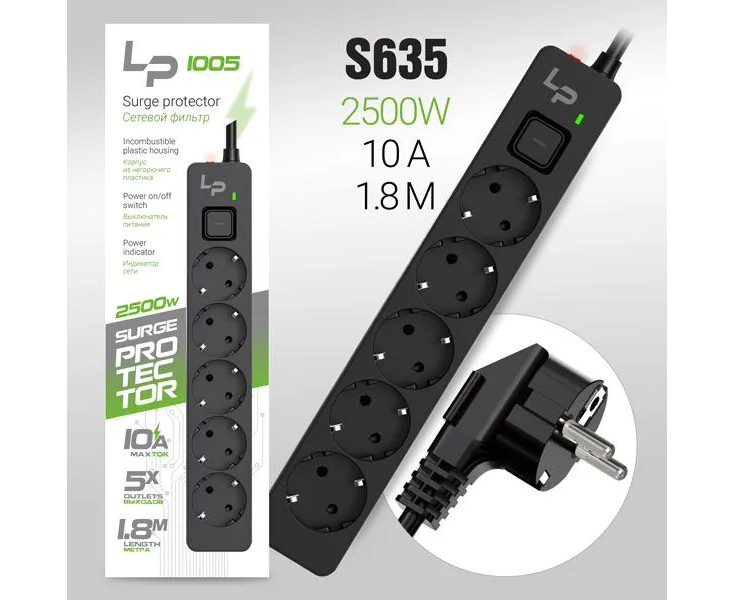 Сетевой фильтр-удлинитель LP LP1005 5розеток С/З 10А с выкл. 1.8м black