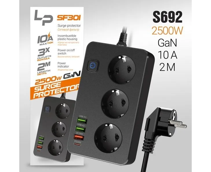 Сетевой фильтр-удлинитель LP SF301 3розетки 3USB A+C Gan 45W/10А 2500W 2м black