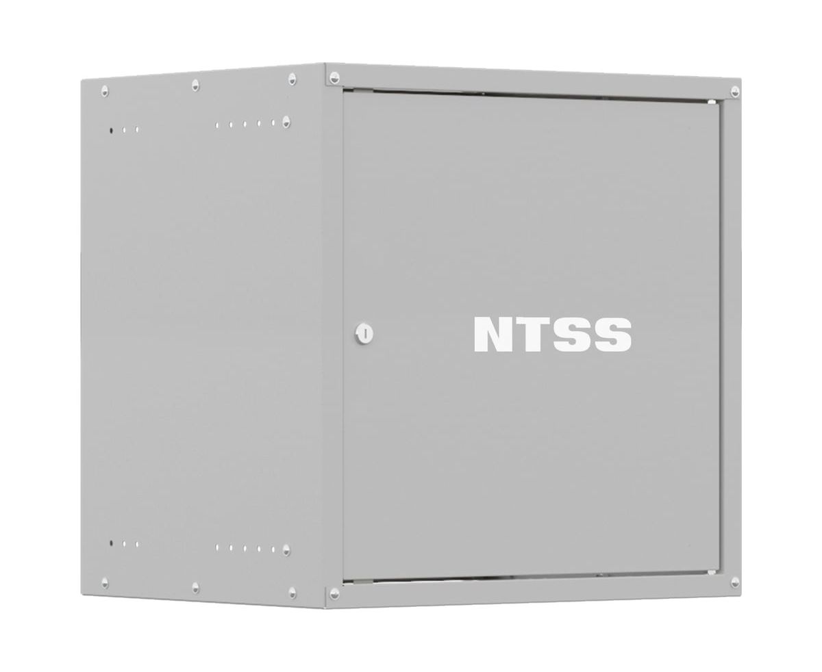 Разобранный настенный шкаф NTSS серии «W» с передней дверью, открываемыми боковыми стенками на защелках, задней стенкой и панелями пола и потолка. В комплекте 1 пара 19” профилей, уголки для поддержки оборудования. Наличие стальной глухой двери добавляет дополнительную механическую защиту и ограничивает осмотр содержимого шкафа.