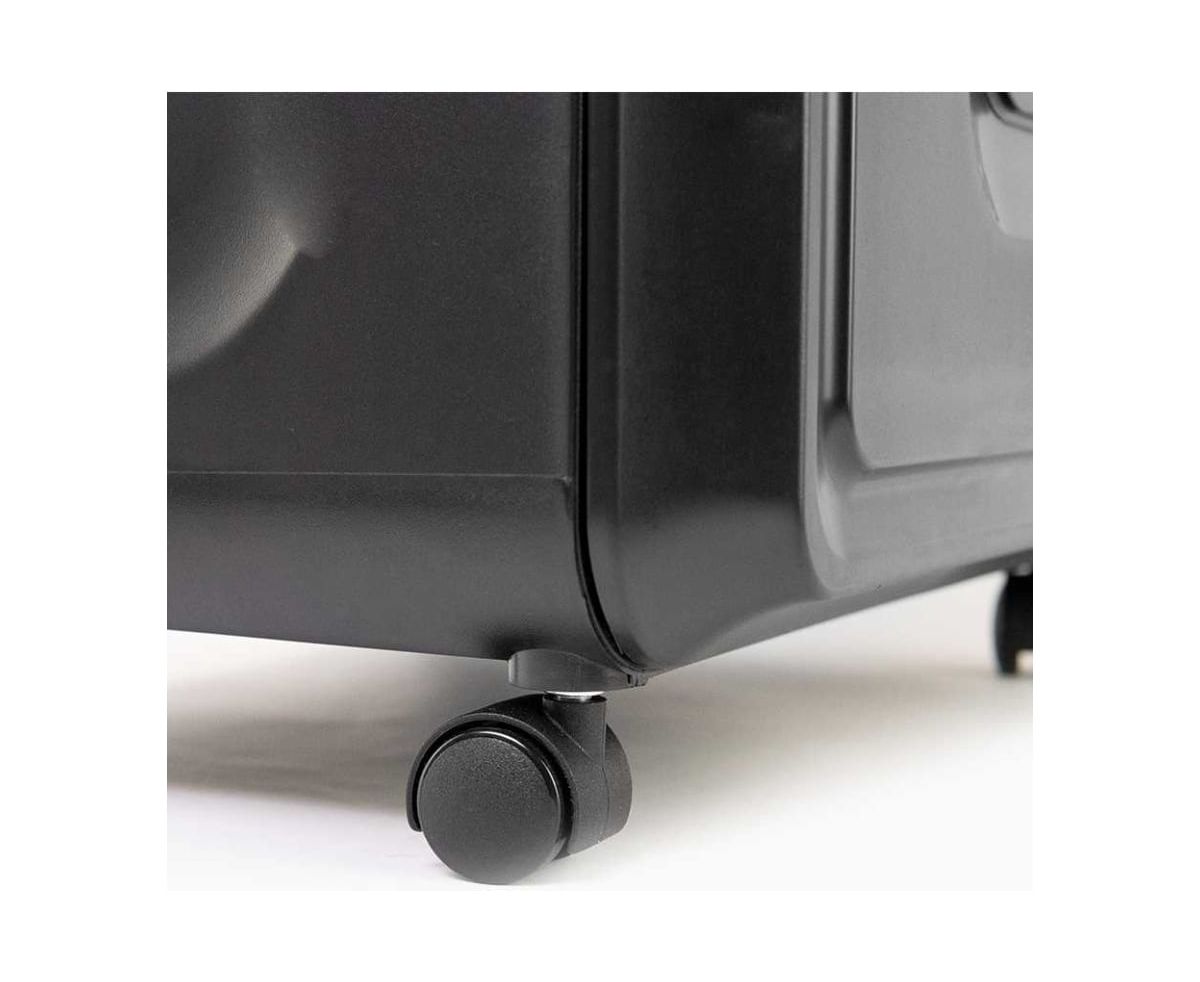 Устройство оснащено выдвижной корзиной с емкостью 32 литра, что позволяет вместить до 600 листов уничтоженных материалов. Габариты шредера составляют 385 х 280 х 593 мм, а также имеются колеса для легкого перемещения устройства из одного места в другое.
