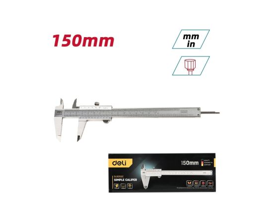Штангенциркуль Deli DL92150C 150мм, нерж, метрическая/дюймовая шкала, кейс