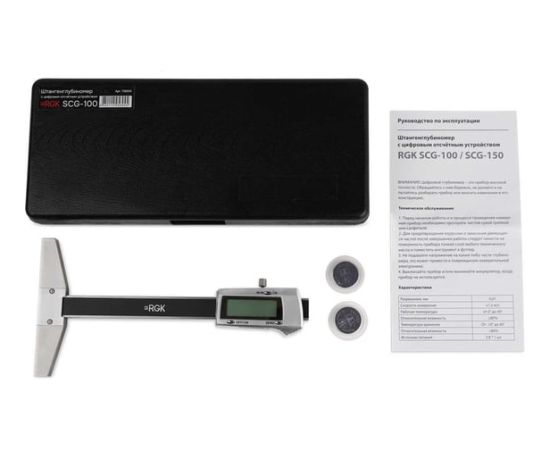 Цифровое отсчетное устройство с дискретностью 0,01 работает в метрической и британско-американской системах мер, переключаемых нажатием одной кнопки, выдавая результаты в миллиметрах или дюймах. Для питания RGK SCG-100 используется 3-вольтовый элемент типа CR2032.