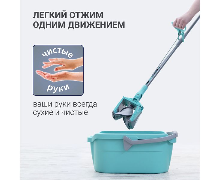 Швабра Care Clean с системой отжима предназначена для влажной уборки любых видов напольных покрытий и относится к системе «чистые руки». Идеально подходит для уборки квартир до 100 кв.м. Система «отжима» одним движением отжимает насадку, и ваши руки всегда остаются сухими и чистыми! Мягкая ручка для отжима из вспененного пластика, удобная для захвата двумя руками, защищает руки от образования мозолей. Платформа швабры легко вращается на 360 градусов, а равномерный прижим платформы к полу позволяет делать уборку без разводов. На торцах платформы имеются элементы из эластичного пластика, которые защищают мебель от повреждений и царапин в процессе уборки. Швабра Care Clean version 2.0 модель HM 67, производится из ударопрочного ABS пластика. Насадка швабры из микрофибры обладает хорошей способностью впитывать и удерживать воду, легко отжимается, не впитывает запахи, прочно крепится к платформе швабры на крючки, выдерживает до 600 циклов уборки. Насадку можно стирать в стиральной машинке при температуре 60 градусов. На ручке швабры есть петля для подвеса на крючок, что позволяет хранить ее компактно.