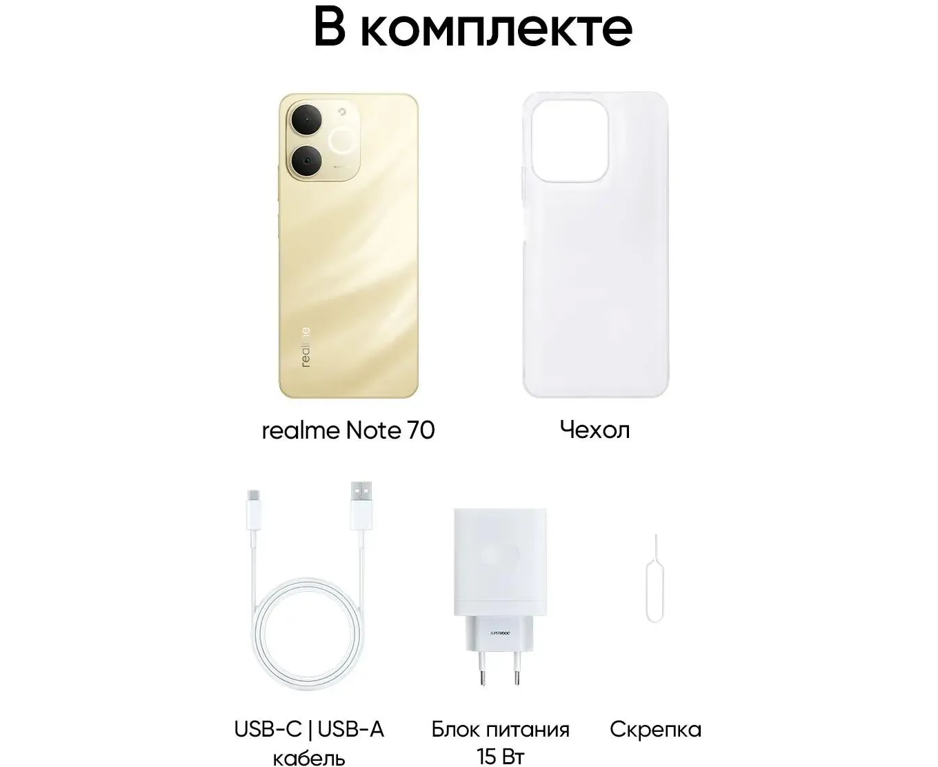 документация, зарядное устройство, кабель USB Type-C, скрепка для извлечения слота SIM-карты/карты памяти, чехол