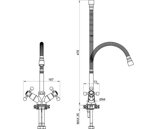 Смеситель для кухни комплектуется усиленным крепежом из нержавеющей стали с ребром жесткости. Гибкая подводка увеличенной длины 60 см позволяет избежать затруднений при монтаже смесителя.