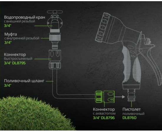 Соединитель быстросъемного типа обеспечивает плотное и надежное соединение между поливочным пистолетоми шлангом или другими поливочными аксессуарами. Он имеет универсальный разъем, который совместим с большинством поливочных пистолетов на рынке. Это позволяет использовать соединитель с различными устройствами, обеспечивая гибкость и универсальность в использовании.