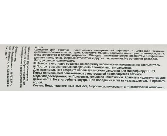 Описание: Средство для очистки пластиковых поверхностей офисной и цифровой техники: системных блоков компьютеров, клавиатур, мышей, корпусов монитров, принтеров, МФУ, факс-аппаратов и других устройств. Обладает антистатическим эффектом. Не отставляет разводов.