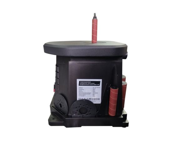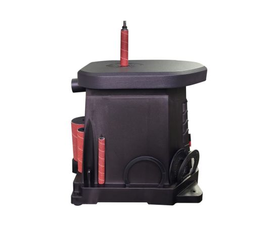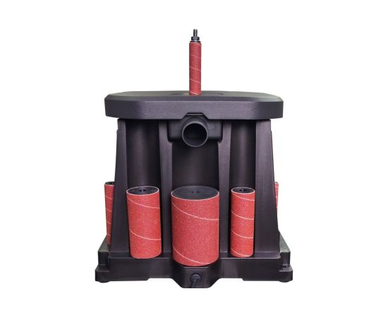 Пластиковый корпус имеет четыре крепежных отверстия, которые служат для фиксации на верстаке или столе. Станок оптимален для работы с кромками, торцами и краями заготовок с вогнутым профилем. В зависимости от кривизны обрабатываемой поверхности подбирается диаметр абразивной втулки (13, 19, 26, 38, 51, 76 мм). Высокая эффективность при использовании оснастки с такой рабочей поверхностью достигается за счет осцилляции – вертикального перемещения вала. Это увеличивает линейную скорость абразива и предотвращает возникновение продольных царапин из-за дефектов оснастки. Небольшие габариты и вес обеспечивают легкость размещения станка, а также рациональное хранение и транспортировку. В основании станка расположены ложементы для хранения всей оснастки.