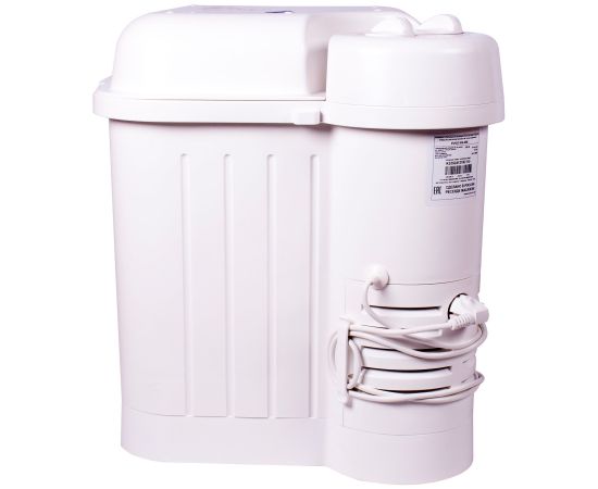 таймер стирки до 15мин, крышка-тазик емкостью 9л, реверс, фильтр для сбора ворса и пуха, отжим отсутствует; максимальная потребляемая мощность (Вт) 245