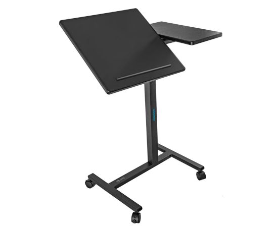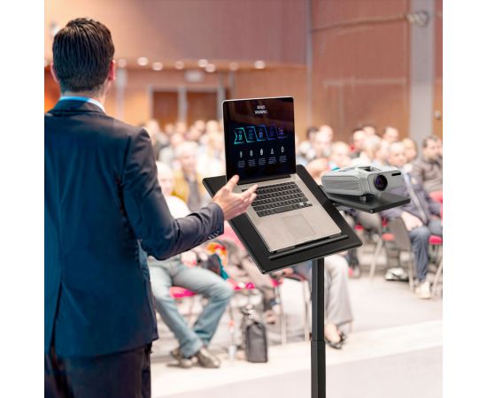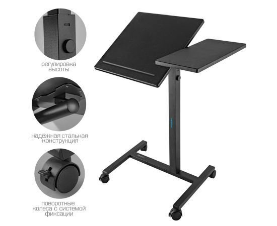 Специально разработанная наклонная секция имеет размер 40х40 см, а фиксированная секция - 40х19,5 см. Толщина столешницы составляет 15 мм, что обеспечивает надежную поддержку для вашего ноутбука или проектора. Материал столешницы - МДФ, а стойка выполнена из прочной стали.