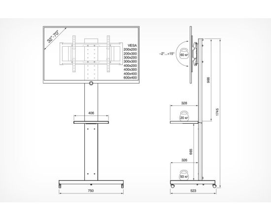 Мобильная стойка для ТВ и аудио- видеоаппаратуры, которая идеально подойдет как для домашнего использования, так и для офисов, торговых центров и спортивных сооружений. Кронштейн на стойке регулируется в 7 положениях по высоте с шагом в 5 см для удобного расположения ТВ.